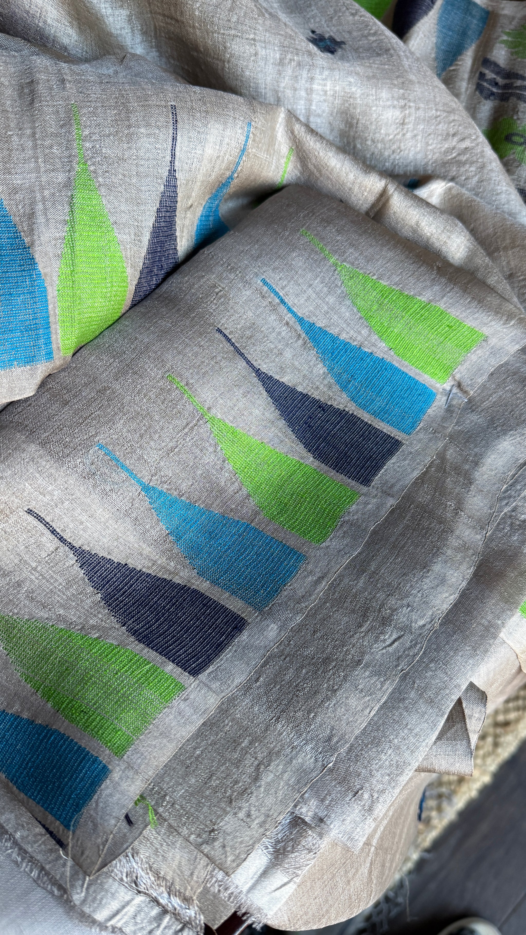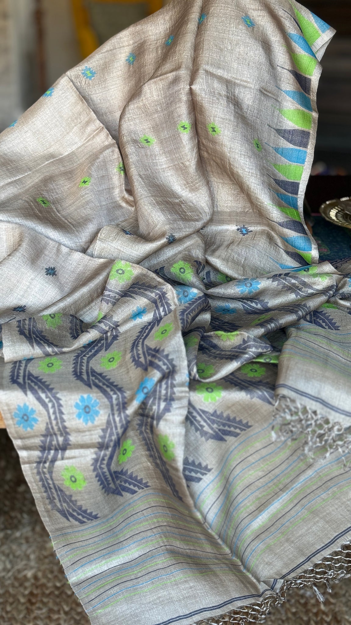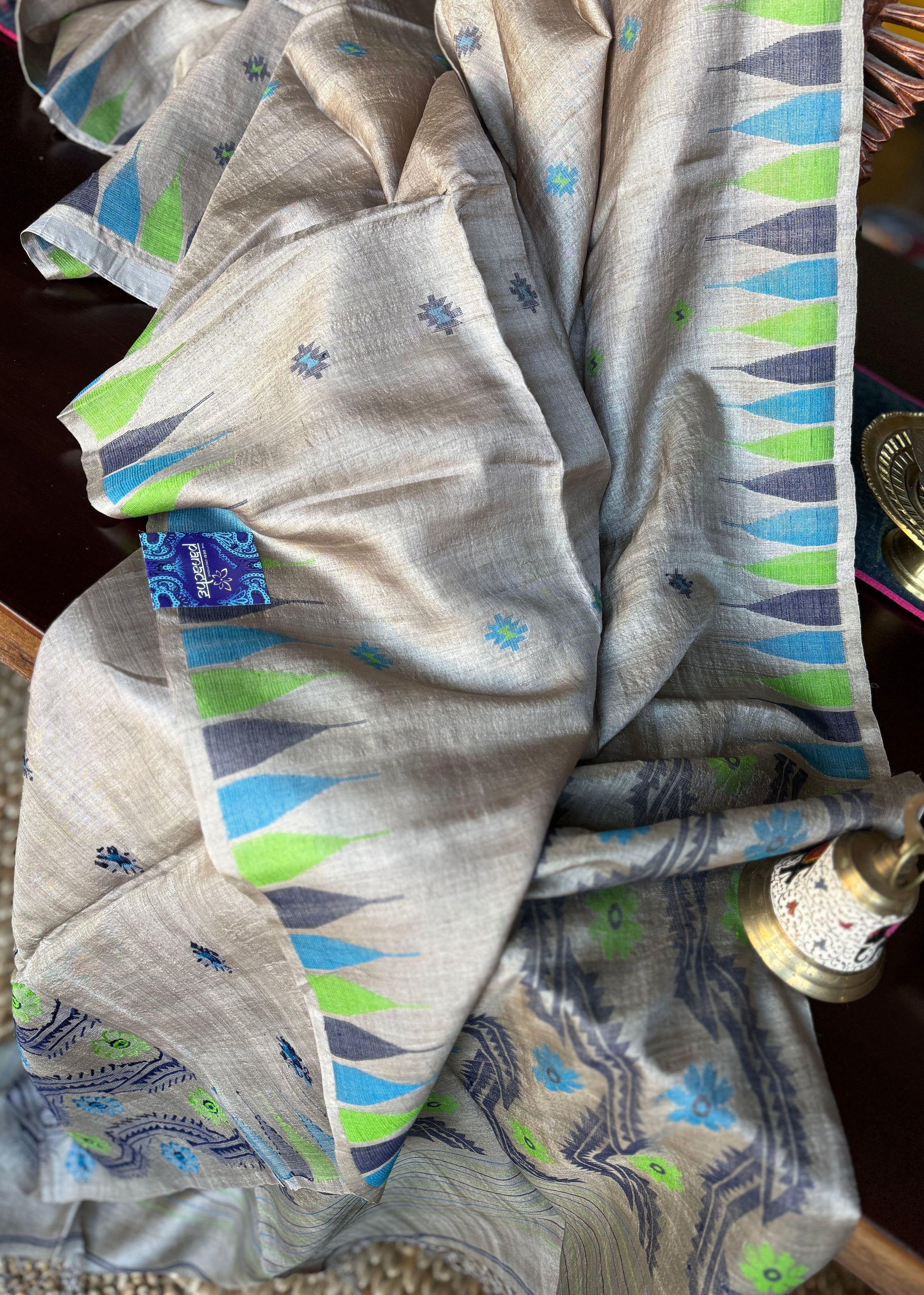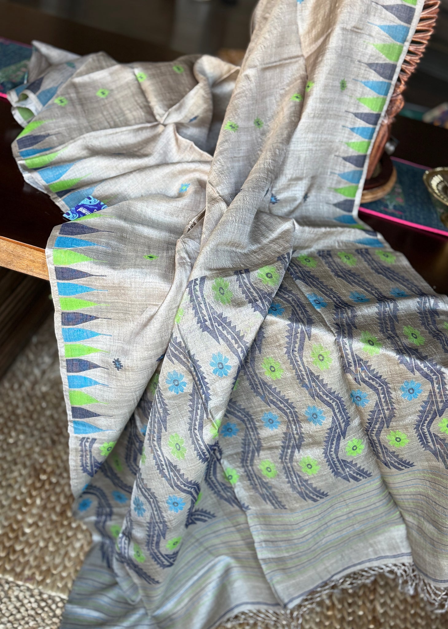 Pure Tussar Silk Jamdaani - Grey Multi Color